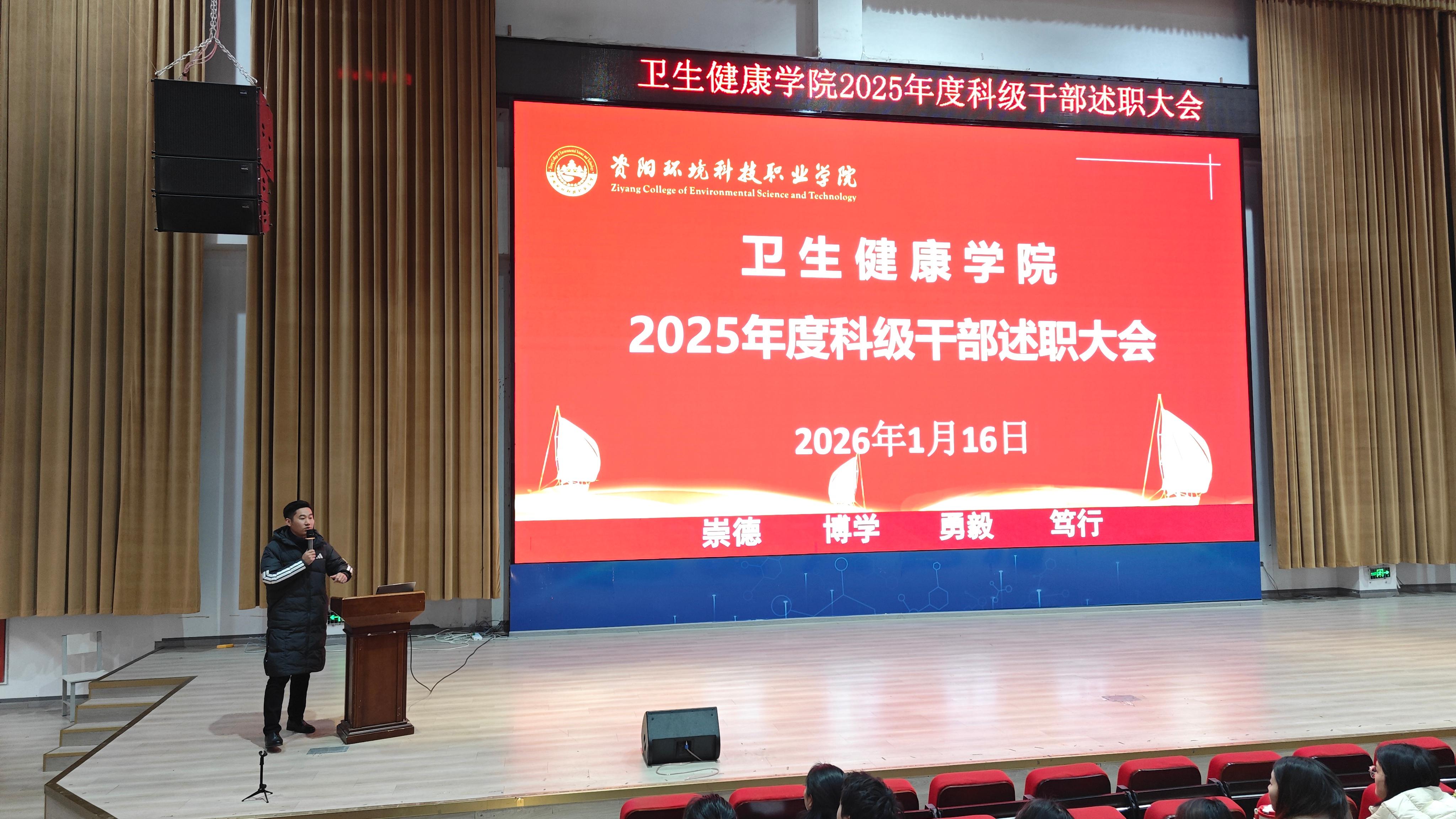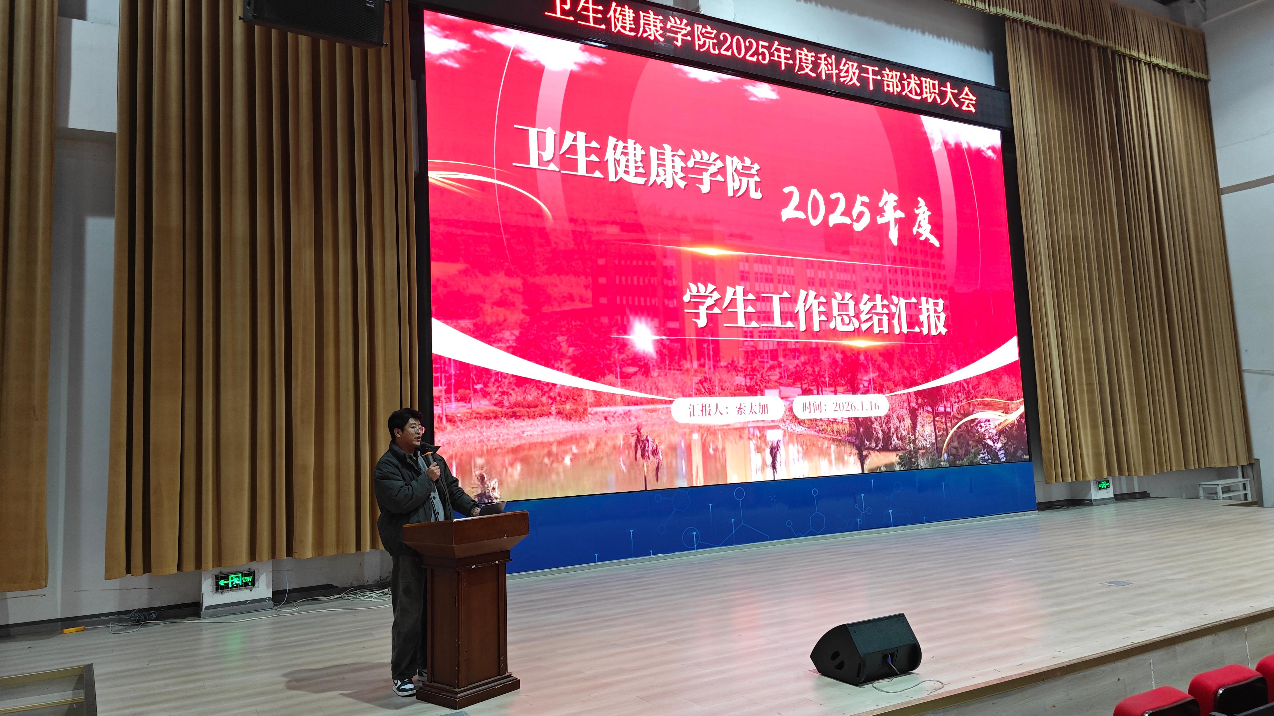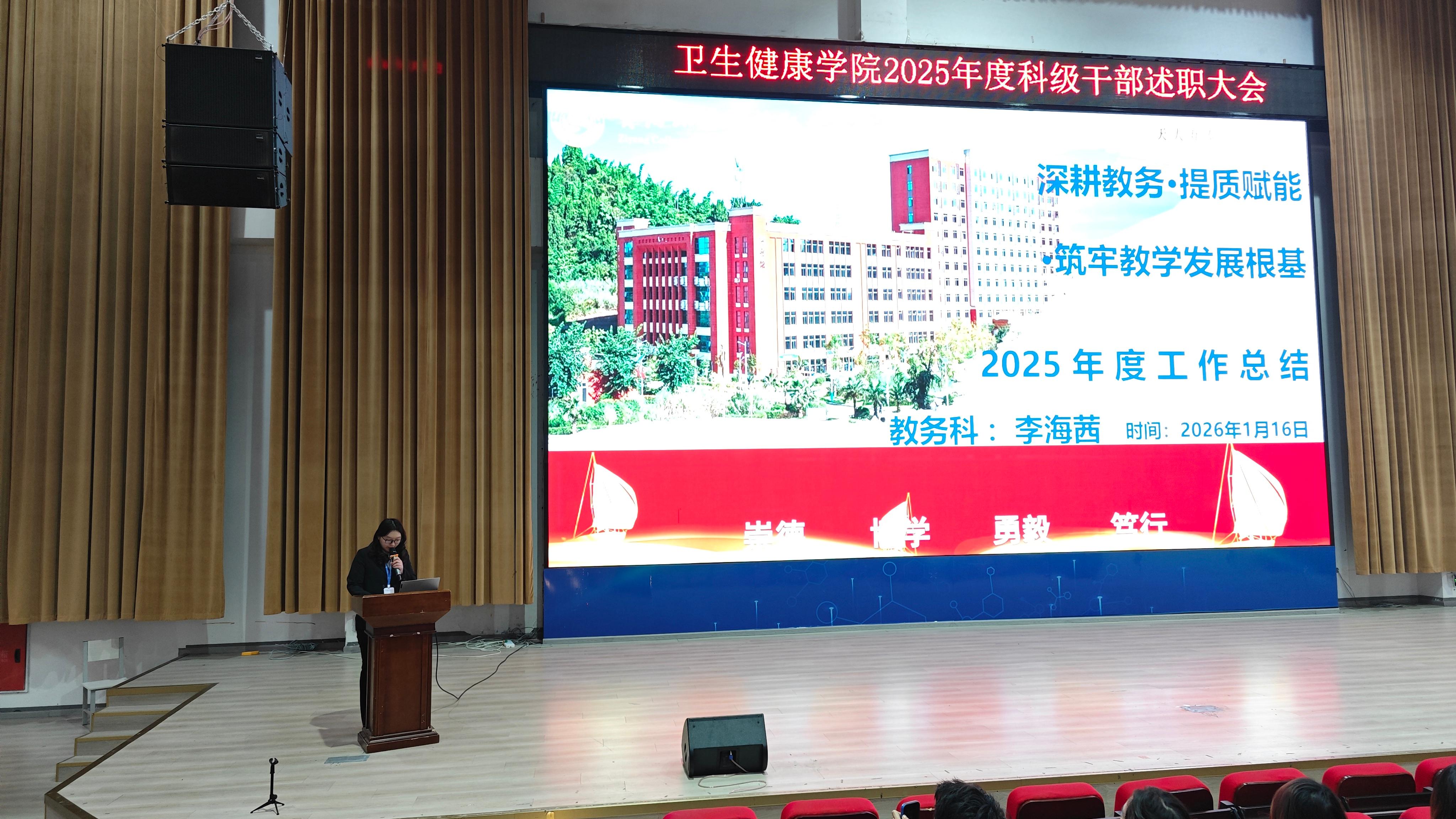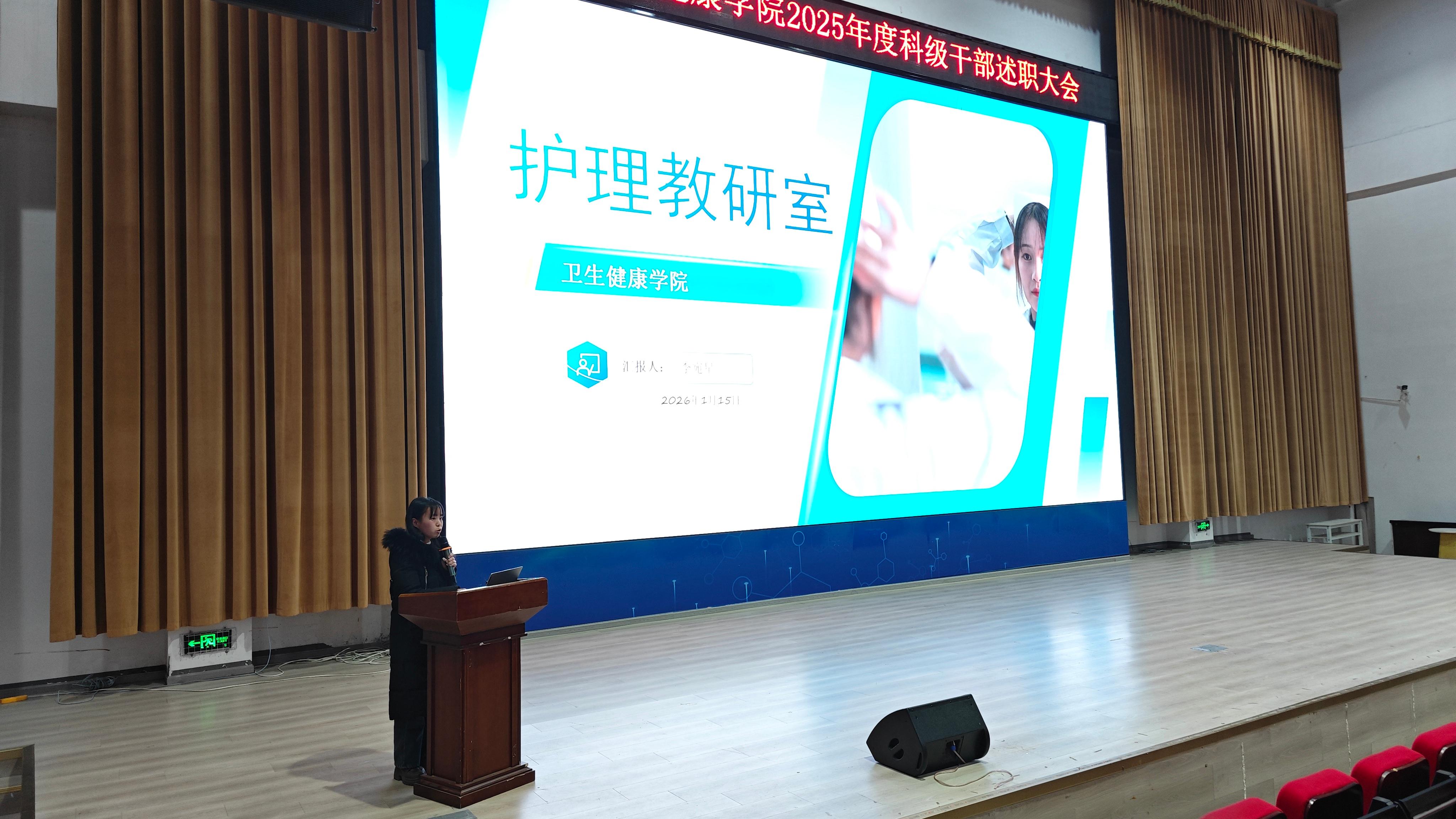为全面总结2025年学院各项工作成效,梳理经验、查找不足,明确新一年发展方向,进一步凝聚共识、激发干劲,2026年1月16日上午10点,卫生健康学院于C101隆重召开2025 年科级干部年终述职大会。学校党委委员,纪委书记龚远、学院党总支书记,副院长代术华以及全体教职工参会,会议由学院院长助理陈华英主持。