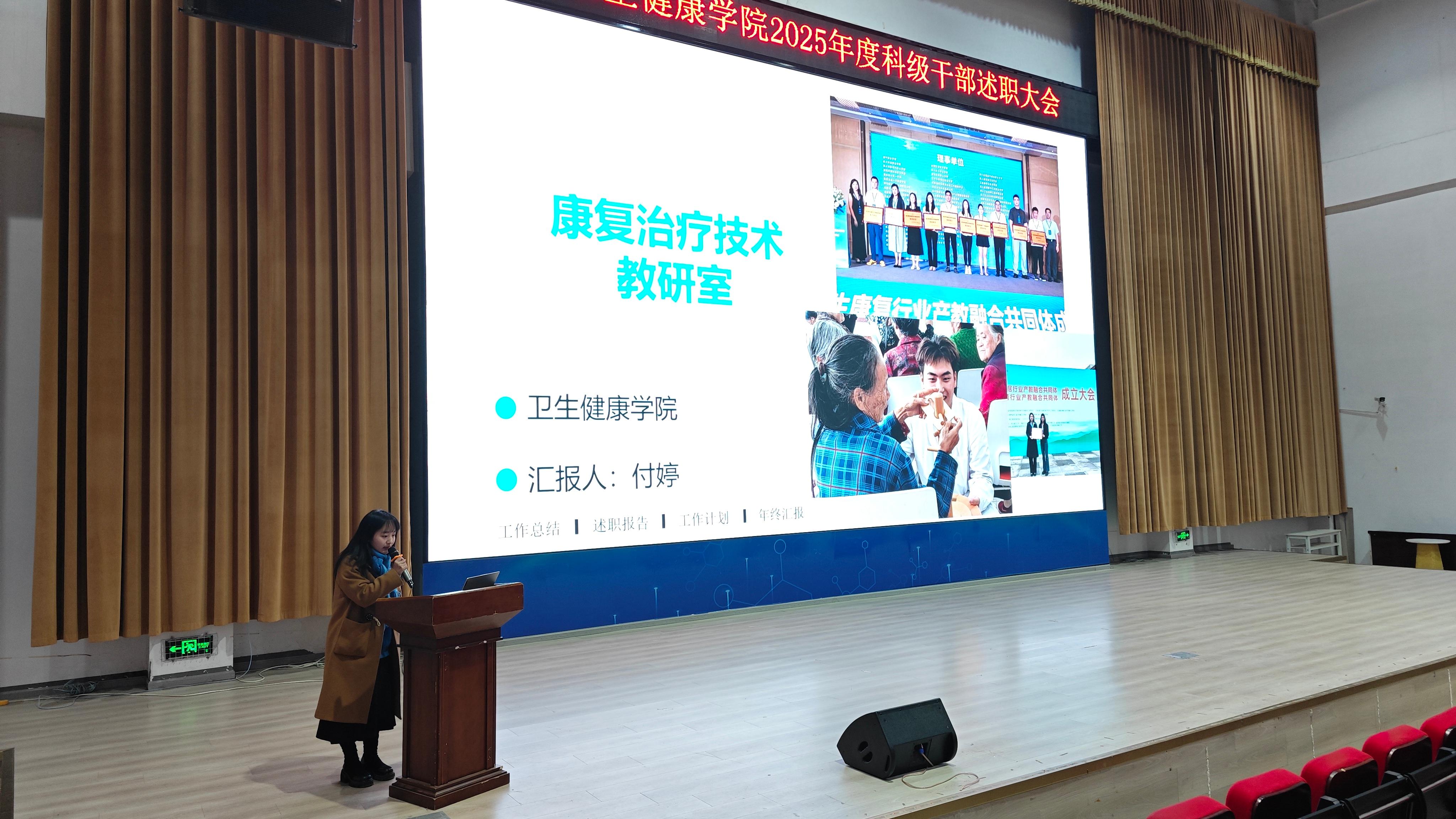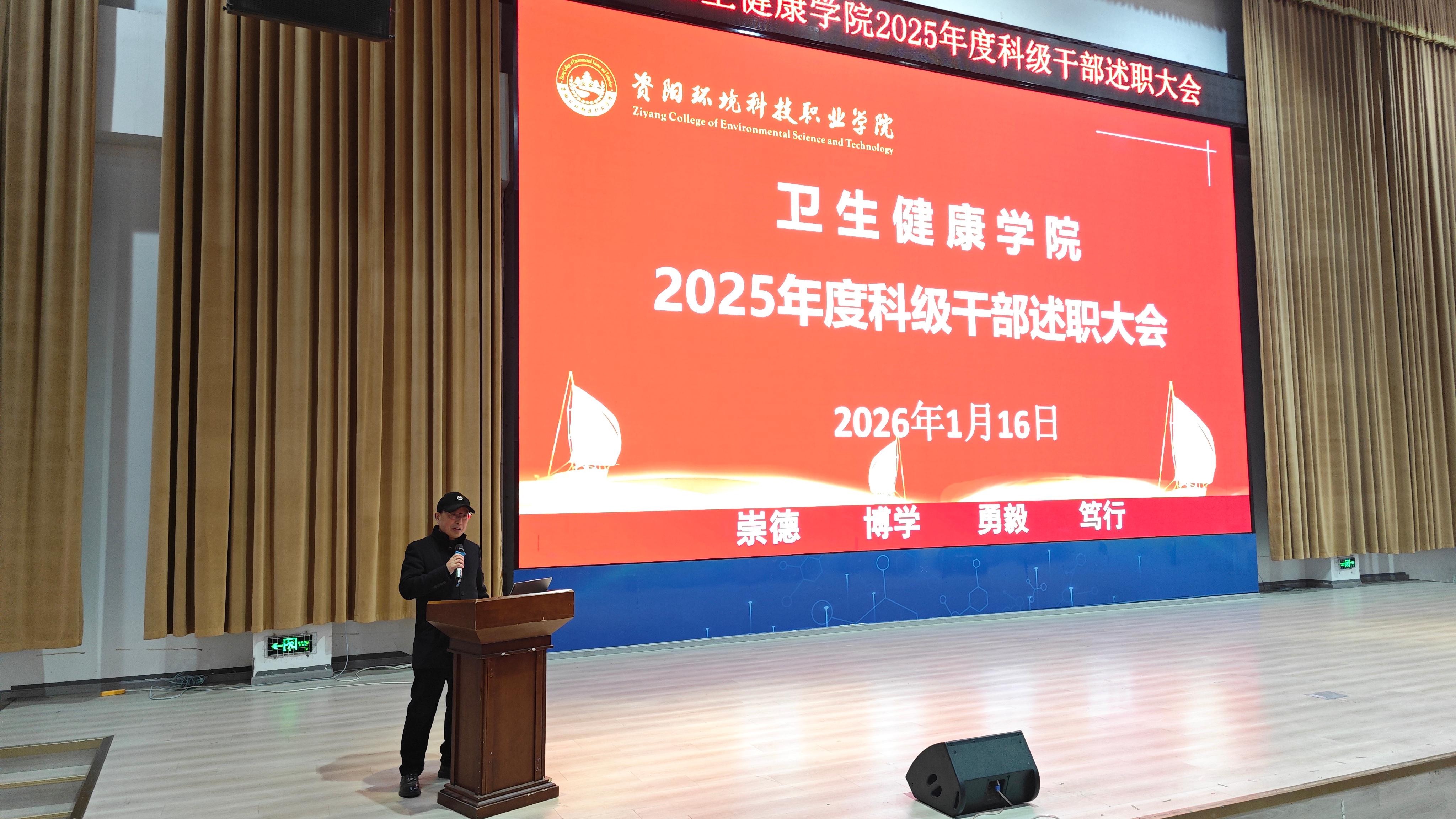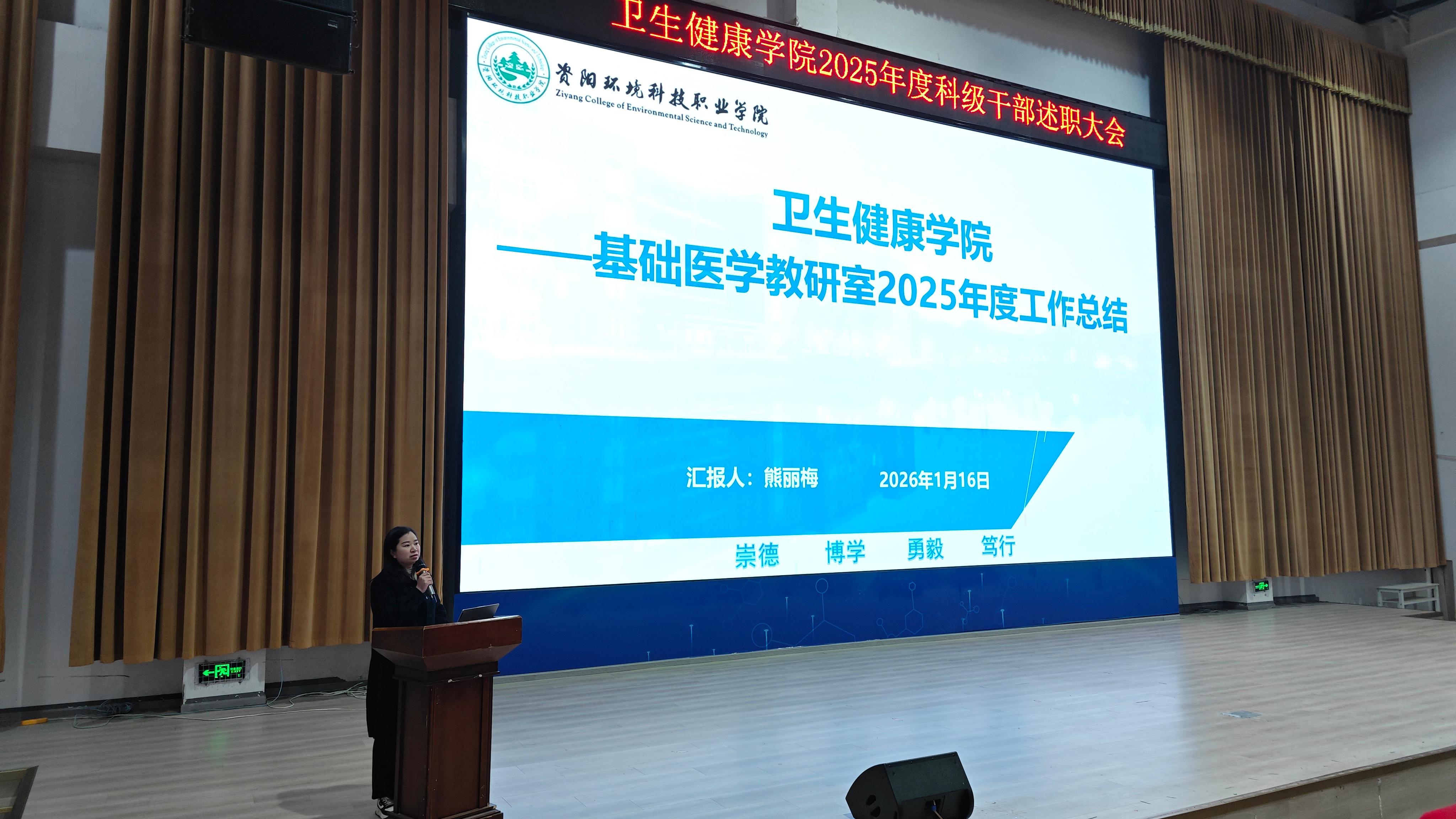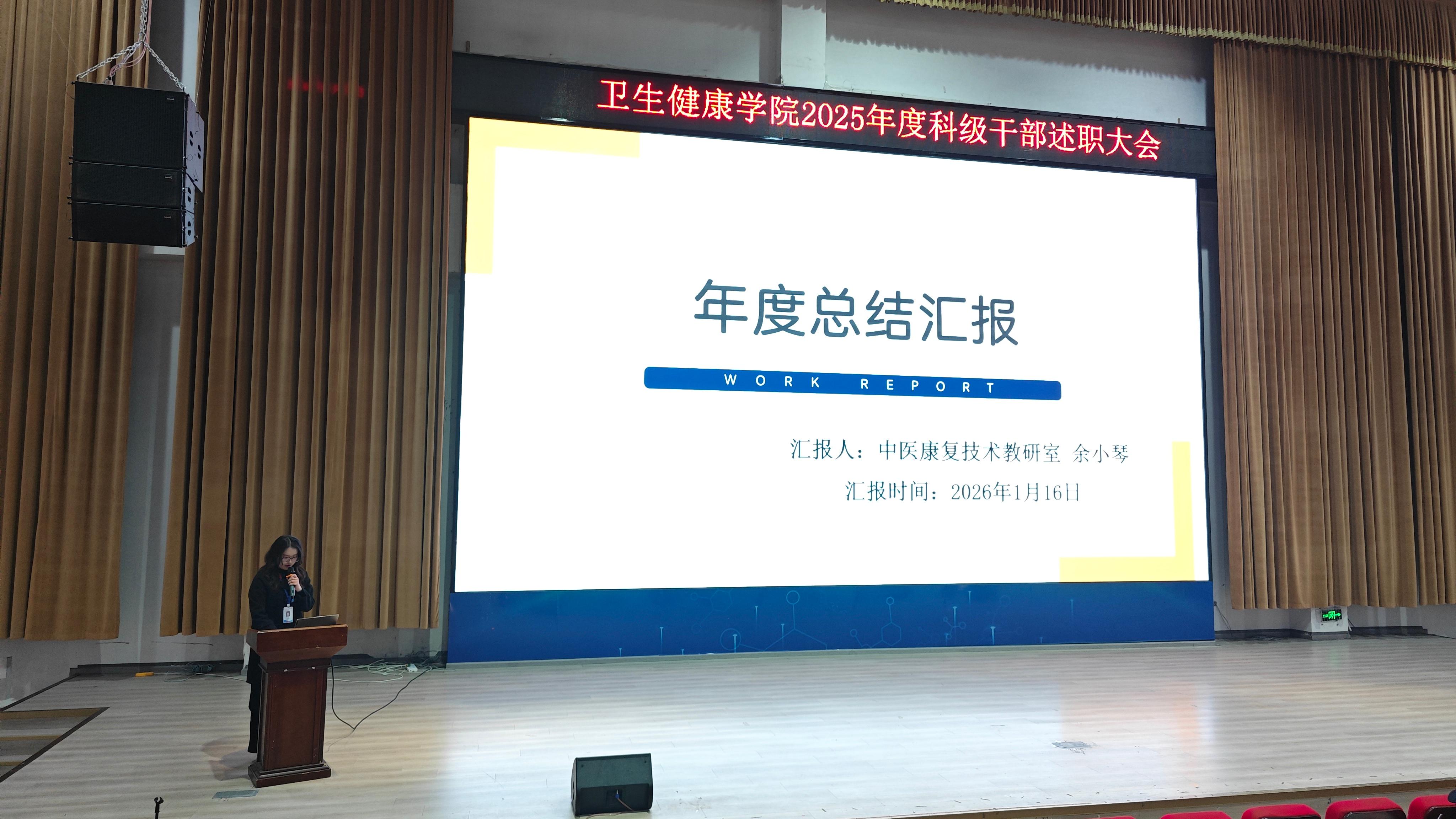 为全面总结2025年学院各项工作成效,梳理经验、查找不足,明确新一年发展方向,进一步凝聚共识、激发干劲,2026年1月16日上午10点,卫生健康学院于C101隆重召开2025 年科级干部年终述职大会。学校党委委员,纪委书记龚远、学院党总支书记,副院长代术华以及全体教职工参会,会议由学院院长助理陈华英主持。