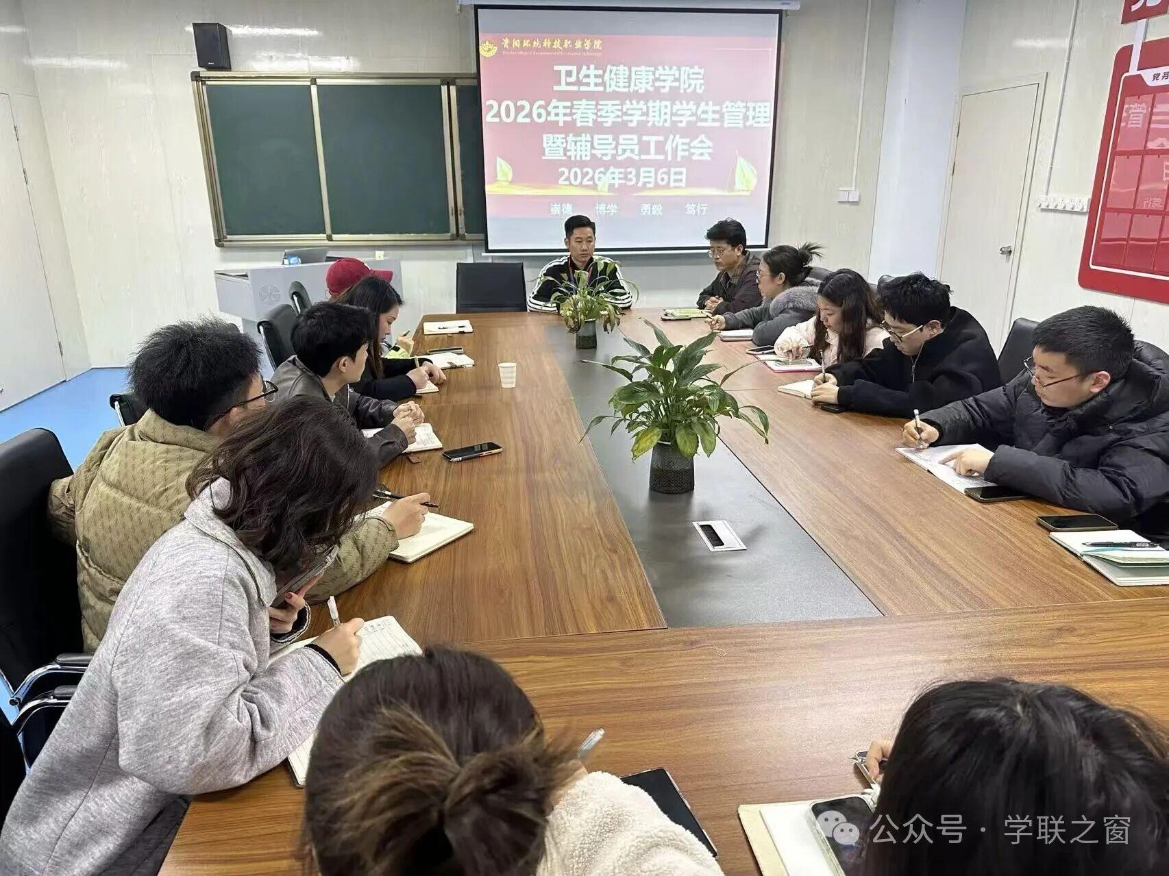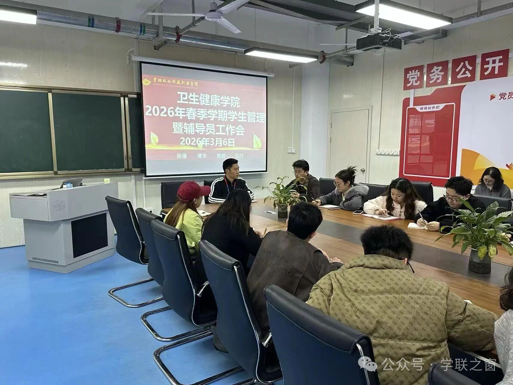 为深入贯彻落实学校2026年春季学期学生工作部署,明确新学期学生管理与辅导员工作重点,压实工作责任,凝聚育人合力,切实提升学生管理服务质量和辅导员履职能力,保障新学期各项学生工作平稳有序开展,卫生健康学院于2026年2月27日下午在学术报告厅C101召开2026年春季学期学生管理暨辅导员工作会。学院党总支书记、副院长代术华、院长王建鹏出席会议,全体辅导员参加会议,会议由学院学工科长主持。