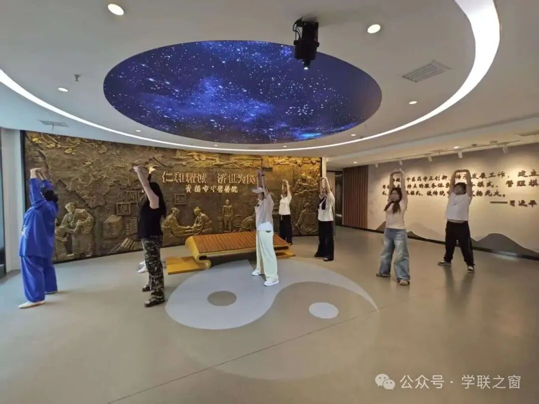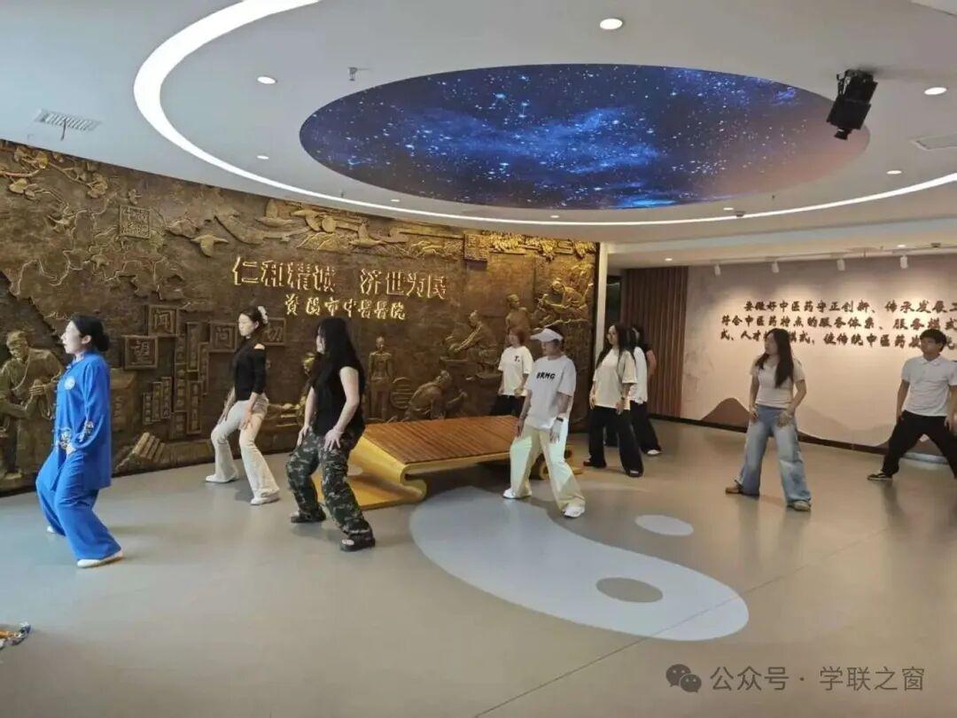 2025年10月15日下午4时,资阳中医院综合楼三楼史策馆。卫生健康学院的志愿者们参与八段锦直播活动,感受传统中医养生文化魅力。